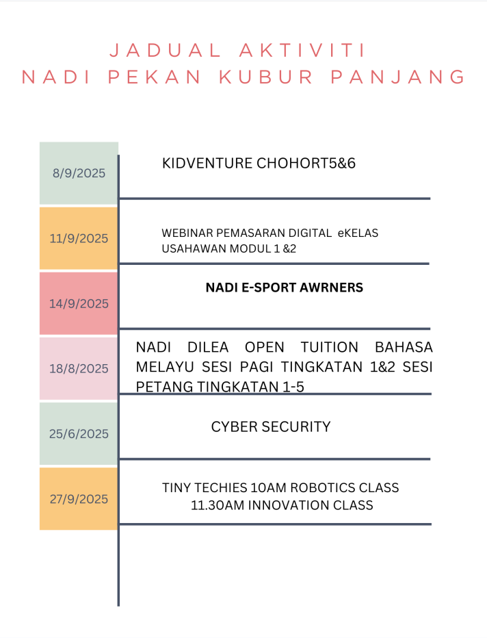 Webinar Pemasaran Digital eKelas Usahawan(AI Untuk Mencipta Kandungan) Tarikh : 20 November 2025Masa : 10.00 Petang – 11.00 PAGITempat : NADI Pekan Kubur PanjangPeserta : 1 Orang Webinar Pemasaran Digital eKelas Usahawan(AI Untuk Mencipta Kandungan) AKTIVITI 📚 Ketahui bagaimana […]