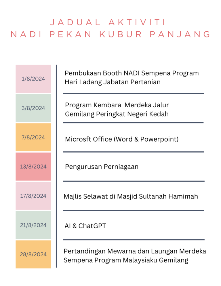 Tarikh : 27 Jun 2024 Masa : 10:00 Pagi hingga 12:00 Tengahari Lokasi : NADI Kg Paya Mengkuang Peserta : 30 Orang Peserta TUJUAN Tujuan Program Info on Wheels dan Lawatan Komuniti Madani NADI Daerah Pendang […]