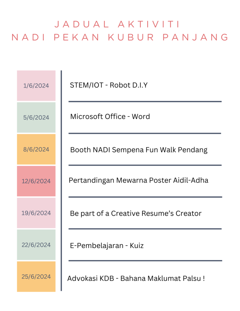 Tarikh : 28 Mei 2024 Masa : 10:00 Pagi hingga 12:00 Tengahari Lokasi : NADI Pekan Kubur Panjang Peserta : 18 Orang Peserta TUJUAN Tujuan Program School Break: Fun-filled Activities adalah untuk mengisi masa lapang para […]