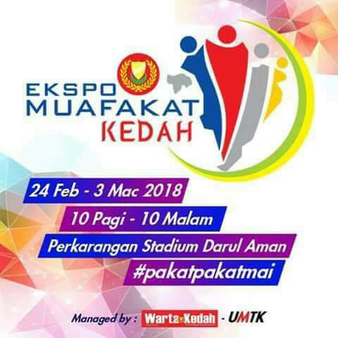 EKSPO MUAFAKAT KEDAH 2018 TEMPAT :STADIUM DARUL AMAN KEDAH TARIKH :24 FEBRUARI HINGGA 3 MAC MASA :10 PAGI HINGGA 10 MALAM
