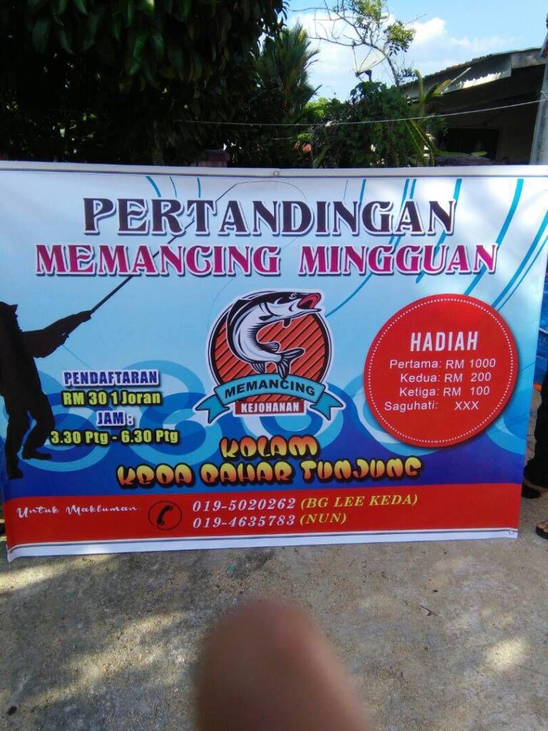 TEMPAT:KOLAM KEDA LAHAR TUNJUNG MASA :3 PETANG TARIKH:9/2/2018 PENDAFTARN 1 JORAN RM 30.00 HADIAH-HADIAH :PERTAMA RM 1000 KEDUA RM 200 KETIGA RM 100