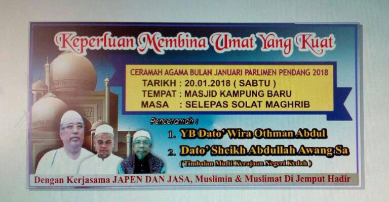 KEPERLUAN MEMBINA UMAT YANG KUAT TARIKH :20 JANUARI 2018 HARI :SABTU MASA :SELEPAS SOLAT MAGHRIB TEMPAT :MASJID KAMPUNG BARU PENCERAMAH :YB DATO’WIRA OTHMAN ABDUL (AHLI PARLIMEN PENDANG) :DATO’ SHEIKH ABDULLAH AWANG SA(TIMBALAN MUFTI KERAJAAN NEGERI KEDAH)