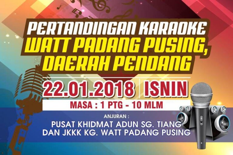 PERTANDINGAN KAROAKE WATT PADANG PUSING DAERAH PENDANG TARIKH :22 JANUARI 2018 MASA :1 PETANG HINGGA 10 MALAM TEMPAT:WATT PADANG PUSING ANJURAN :PEJABAT ADUN SG TIANG DAN JKKK WATT PADANG PUSING