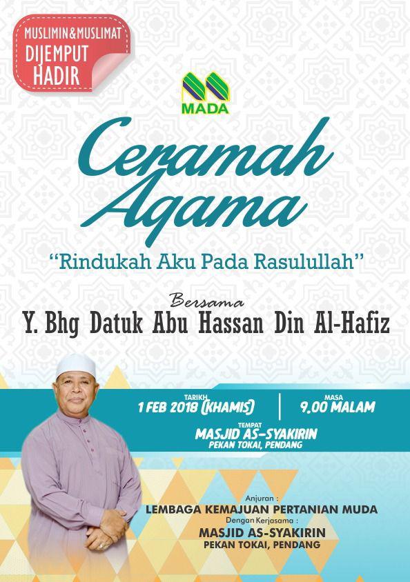 CERAMAH AGAMA “RINDUKAH AKU PADA RASULULLAH” PENCERAMAH: YANG BERBAHAGIA DATUK ABU HASSAN DIN AL HAFIZ TEMPAT :MASJID AS- SYAKIRIN PEKAN TOKAI TARIKH:1 FEBRUARI 2018 MASA :9.MALAM ANJURAN BERSAMA LEMBAGA KEMAJUAN PERTANIAN MUDA DAN MASJID AS-SYAKIRIN