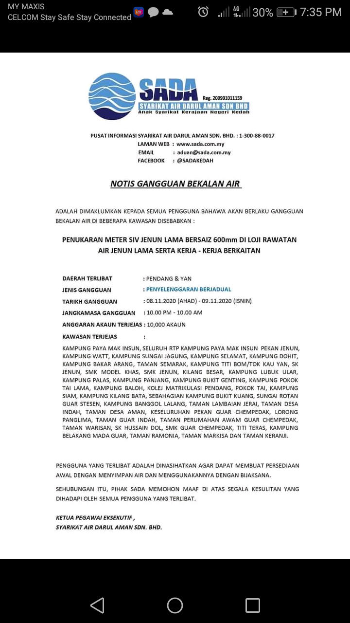 NOTIS GANGUAN BEKALAN AIR DAERAH PENDANG DAN YAN