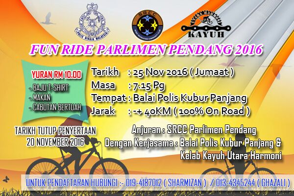 TARIKH :25 NOVEMBER 2016 (JUMAAT) MASA :7.15 PAGI TEMPAT :BALAI POLIS KUBUR PANJANG JARAK : + – 40 KM (100 % ON ROAD) ANJURAN BERSAMA SRCC PARLIMEN PENDANG DENGAN KERJASAMA BALAI POLIS KUBUR PANJANG […]