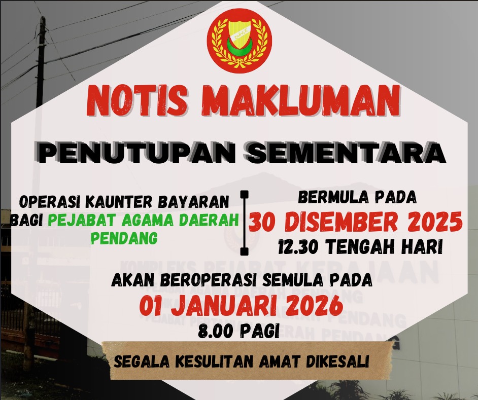 NOTIS MAKLUMAN PENUTUPAN SEMENTARA OPERASI KAUNTER PEMBAYARAN PEJABAT AGAMA DAERAH PENDANG